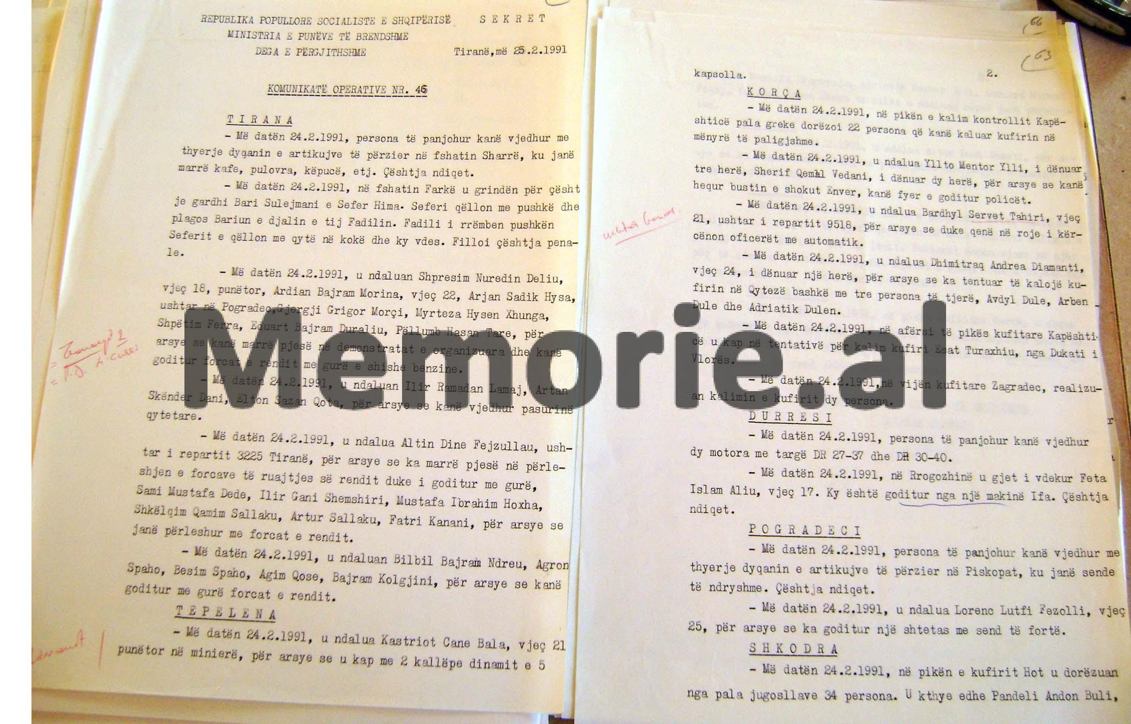 – Më datën 26.2.1991, u ndalua Sokol Petrit Alia, vjeç 17, punëtor, Ahmet Shaban Jakupi, vjeç 25, i pa zënë me punë, Eduart Kasem Isaku, vjeç 20, ushtar i repartit 1155 Korçë, për arsye se kanë kryer krimin e sjelljes së padenjë, duke qëlluar me gurë efektivin e Shkollës së Bashkuar të Oficerëve “Enver Hoxha” dhe forcat e ruajtjes së rendit.