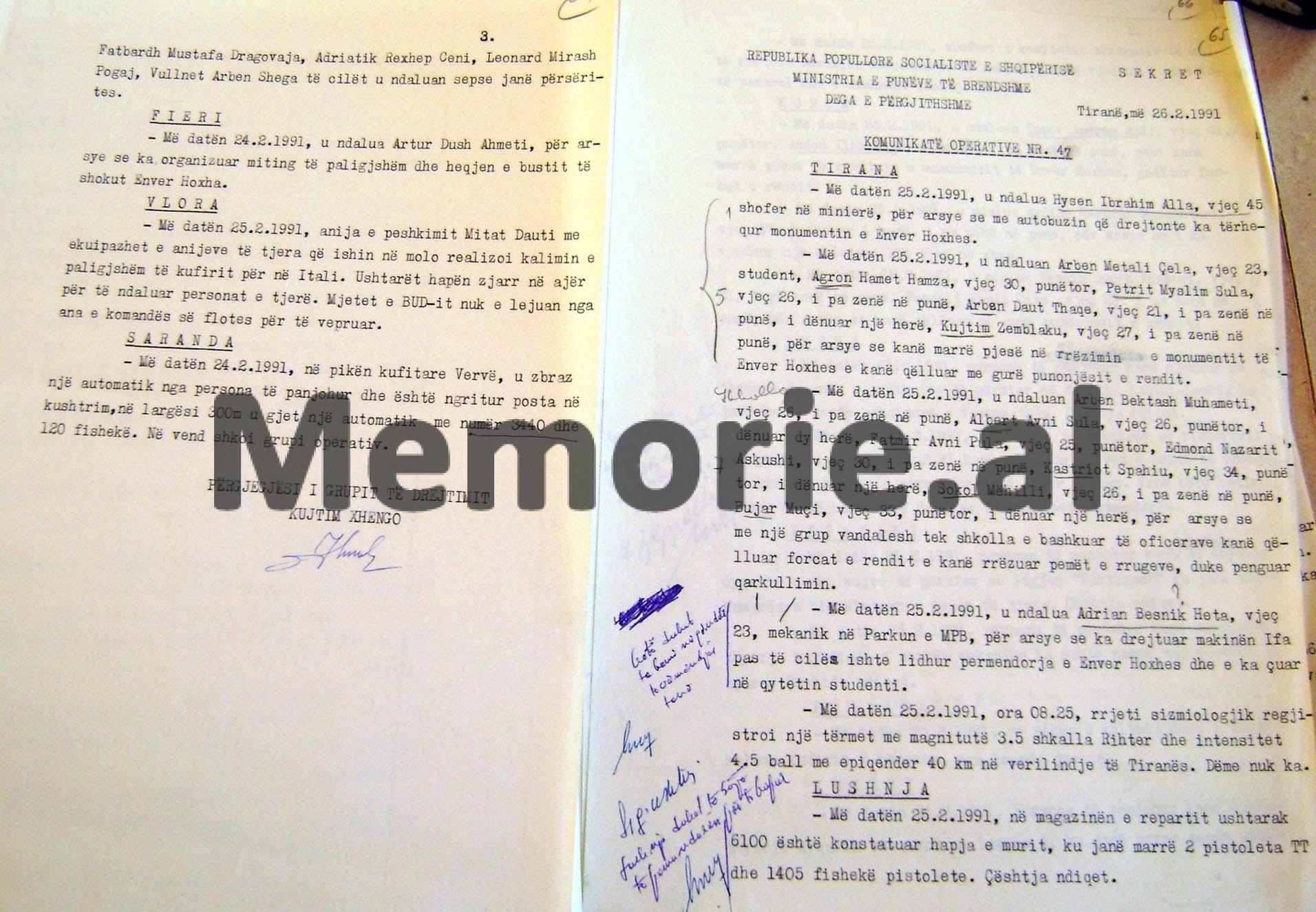 KOMUNIKATA OPERATIVE SEKRETE E E MINISTRISË SË BRENDSHME E DATËS 25 SHKURT 1991, LIDHUR ME NGJARJET E NDODHURA NË RRETHE TË NDRYSHME, KU U ARRESTUAN ME DHJETËRA PERSONA SI PJESËMARRËS NË RRËZIMIN E MONUMENTIT DHE BUSTEVE TË ENVER HOXHËS
