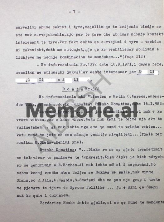 Por fakt është se surbejimi i tyre u vazhdua si zakonisht, d.m.th., me automjet, gjë që e ka vështirësuar zbulimin e lidhjeve me ndonjë kombinacion të mundshëm…”. (Fq. 212) Në informacionin Nr.4932, datë 10.9.1971, i Degës së parë, rezulton se spiunazhi jugosllav është i interesuar për S…Ll….G….Ll…e A….Ll…!