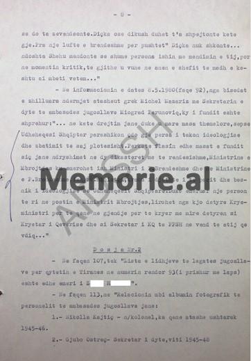 – Në informacionin e datës 8.5.1980, (fq.92), nga bisedat e zhvilluara ndërmjet atasheut grek, Michel Mazaris, me Sekretarin e Dytë të ambasadës Jugosllave, Miodrag Perunoviq, ky i fundit është shprehur: “…në këtë drejtim janë duke u marrë masa themelore, sepse Udhëheqësi Shqiptar parashikon çdo gjë, përsa i përket ideollogjisë, dhe zbatimit të saj plotësisht.