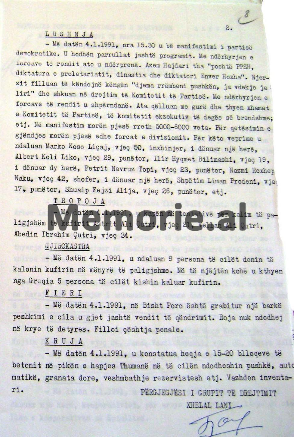 Veç të tjerash kjo gjë bëhet e ditur edhe nga ky dokument arkivor që po publikojmë në këtë shkrim, ku ndodhet komunikata operative sekrete e Ministrisë së Punëve të Brendshme (e nxjerrë nga Arkivi i Ministrisë së Brendshme), ku janë pasqyruar të gjitha ngjarjet e jashtëzakonshme të ndodhura në rrethe të ndryshme të vendit në datën 4 janar 1991. Siç ishte dhe mitingu i Partisë Demokratike i zhvilluar në qytetin e Lushnjes atë ditë, ku përveç Azem Hajdarit, përmenden edhe emrat e disa prej të arrestuarëve, pjesëmarrës në atë miting proteste.