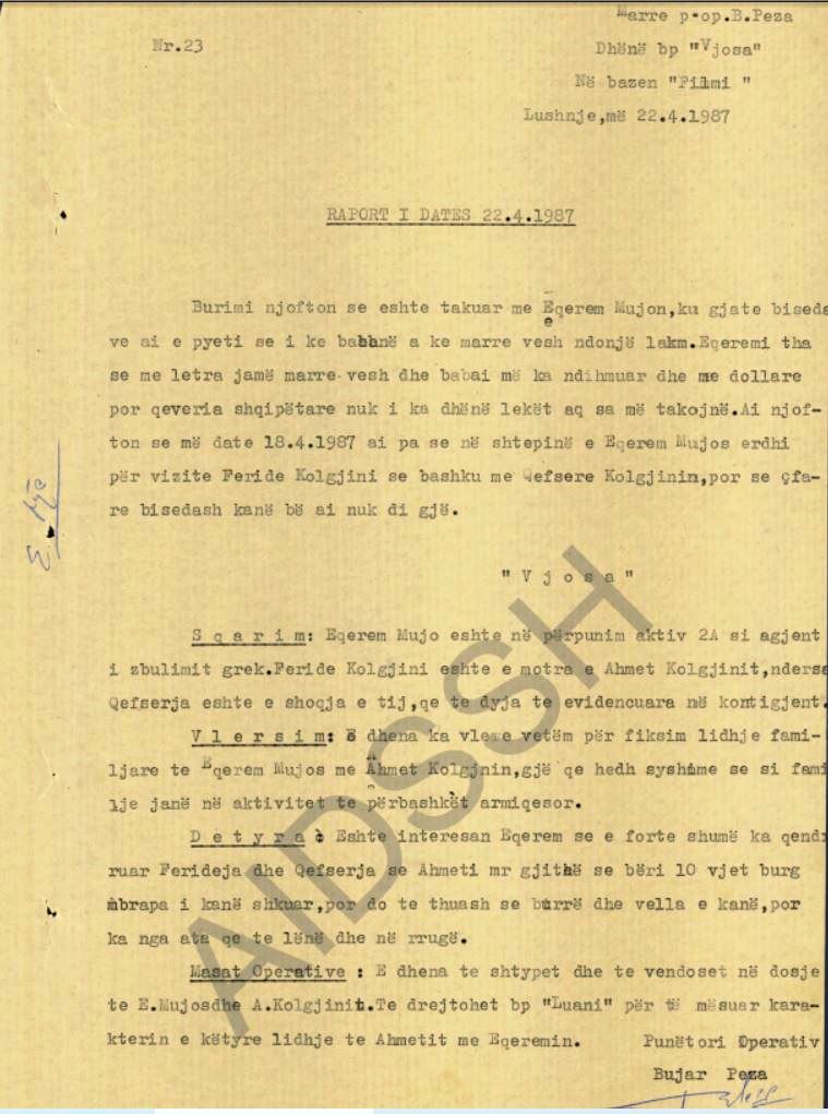 Masat Operative: E dhëna të shtypet dhe të vendoset në dosje të E. Mujos dhe A. Kolgjinit. Të drejtohet B.p. “Luani” për të mësuar karakterin e këtyre lidhjeve të Ahmetit me Eqeremin. / Memorie.al