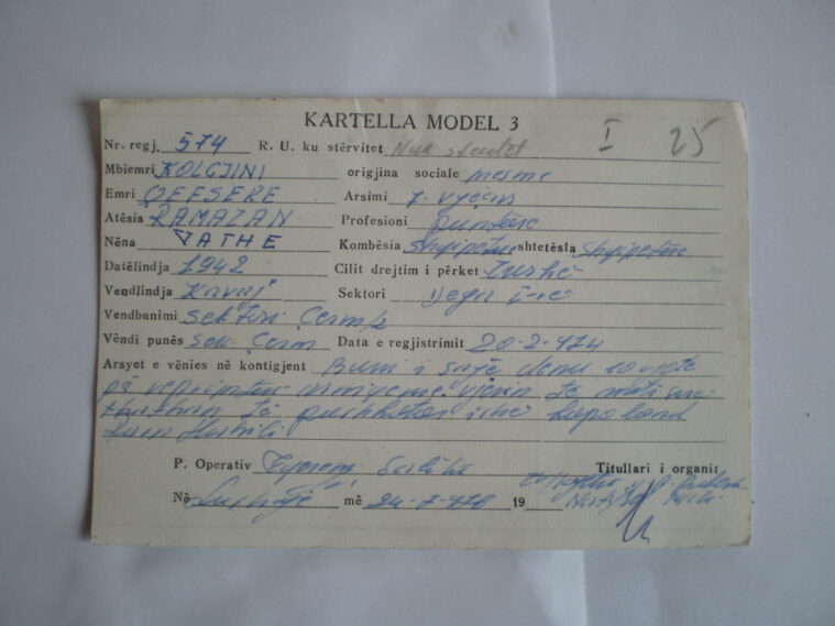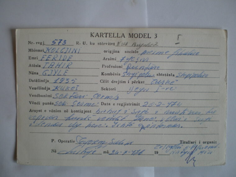 Në këtë shkrim, si foto janë edhe kartelat e Sigurimit të Shtetit, që kishin vue në ndjekje nanën time Qefseren, bashkë me hallën time, Feriden, qysh prej vitit 1974, saktësisht 20.02.1974. Kartelat mbajnë numrat 573 e 574.