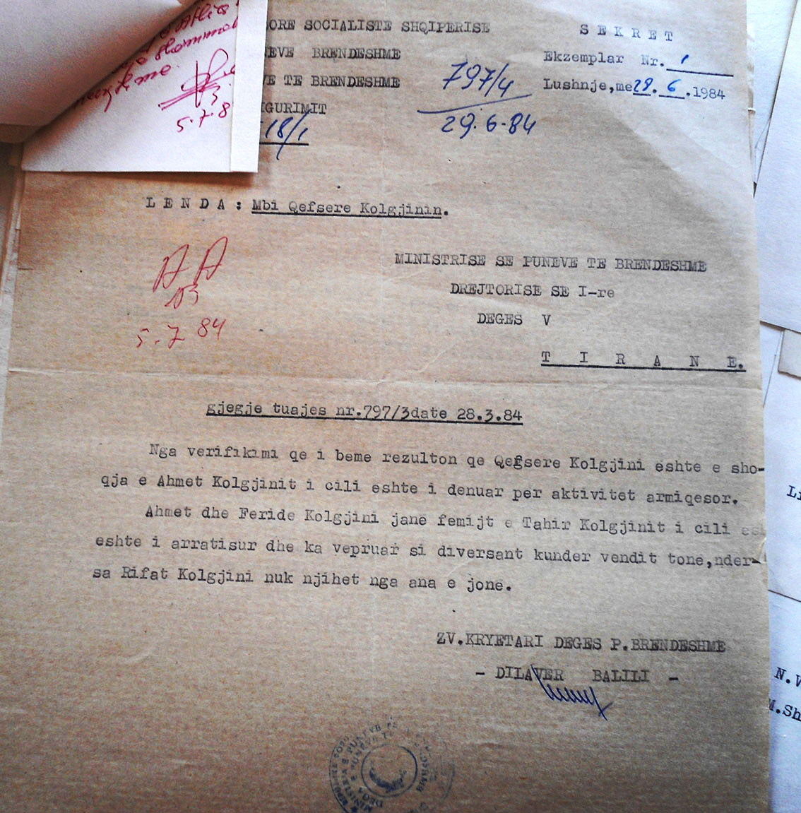 Nga verifikimi që i kemi bërë, Qefsere Kolgjini është e shoqja e Ahmet Kolgjinit, i cili është dënuar për aktivitet armiqësor. Ahmet dhe Ferdide Kolgjini janë fëmijët e Tahir Kolgjinit, i cili është arratisur dhe ka vepruar si diversant kundër vendit tonë. Ndërsa Refat Kolgjini, nuk njihet nga ana jonë.