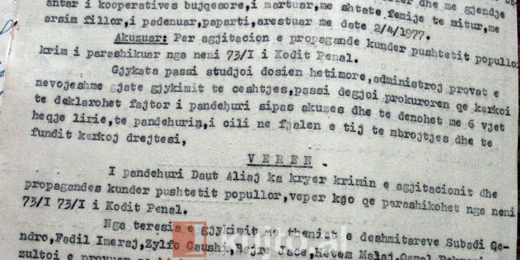 Daut Kanan Aliaj, born in 1937, born and residing in Gorisht, Vlorë, member of an agricultural cooperative, father of 7 minor children, was 40 years old when he was arrested on 2.4.1977 (one day before the elections). He was accused under Article 73/1 of the Criminal Code, i.e., for “agitation and propaganda against the people’s government”. In the trial, 6 witnesses came forward.