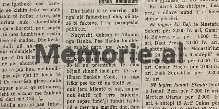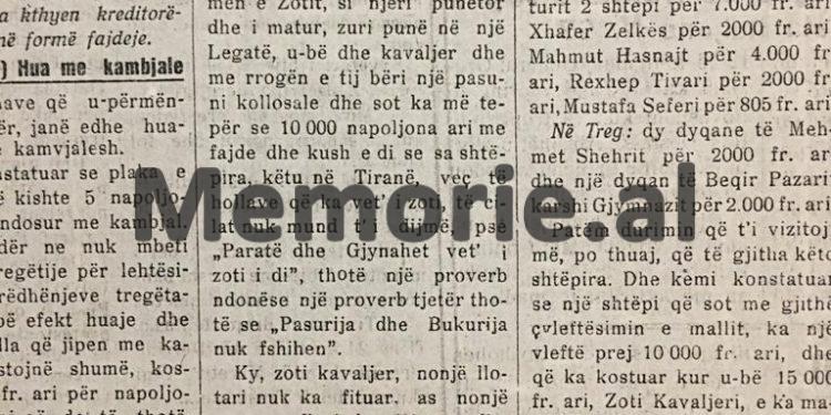 Following the writings of the press about the problem of usury during the years of the Zog Monarchy, many newspapers also had analyzes where various journalists tried to explain the reasons for the spread of the usury epidemic and how many traders fell prey to it. owners not only from Tirana, but also from several other cities in the country. In this regard, in an editorial article, the newspaper “ARBNIA” of 1936, among other things, wrote: “It was a time of abundance and great demand. The world was looking for more new things. The trader had to expand the scope of his activity, but as measured by nature and lacking capital, he walked slowly. The National Bank came. She had every interest in expanding the trade and immediately began to distribute it to thin traders. At first the merchant refused help, but then seeing his neighbor, who had received money from the Bank and was making a lot of money, he took ay. Soon all the merchants created accounts with the Bank and until it was time for abundance, everyone was fine. The merchant took the money and granted loans to his clients. The time came, he collected from his client and paid the Bank. But the time has come for weak cows. Sales decreased and the goods remained on the unsold shelf. The customer had no choice but to pay the merchant. Deadline to pay the trader The bank came and you do not find a penny in the trader’s check. Banka sprite. O money, o protest, seizure, sale of goods, dishonor of the Albanian merchant, who wanted his forehead white. -Aman lends me 20 napoleons on loan and in a month to return 21 he told the neighbor who knew he had money and a bill of exchange. He escaped from the Bank but entered the neighbor who had money. The month came and the merchant wanted to pay the neighbor, he lacked 10 napoleons to pay off the debt and 20 to pay the expensive rent, heavy taxes, and others that have no end. In the old days, there was a lot of money and for a two-room house, 5 napoleons were paid per month. And you can’t find it. The owner of Tirana, who had some land, demanded money with usury and took 25%. He built a large house, which cost him over a thousand napoleons. He had received the money within three or four years. In the first year, he was able to pay the interest, he had settled the house in good people and received a good rent. The rent started to fall. Foreigners began to flee. The time of crisis began. The payment deadline came and there were only 500 napoleons. The creditor did not accept anything: O money o protest, meat, and others… Blackly persuaded him to accept the 500 and for the leftover he did another act, but not for the remaining 500 napoleons, but for 850 paid napoleons after two years putting interest (interest) inside, 35% per year? ”/Memorie.al