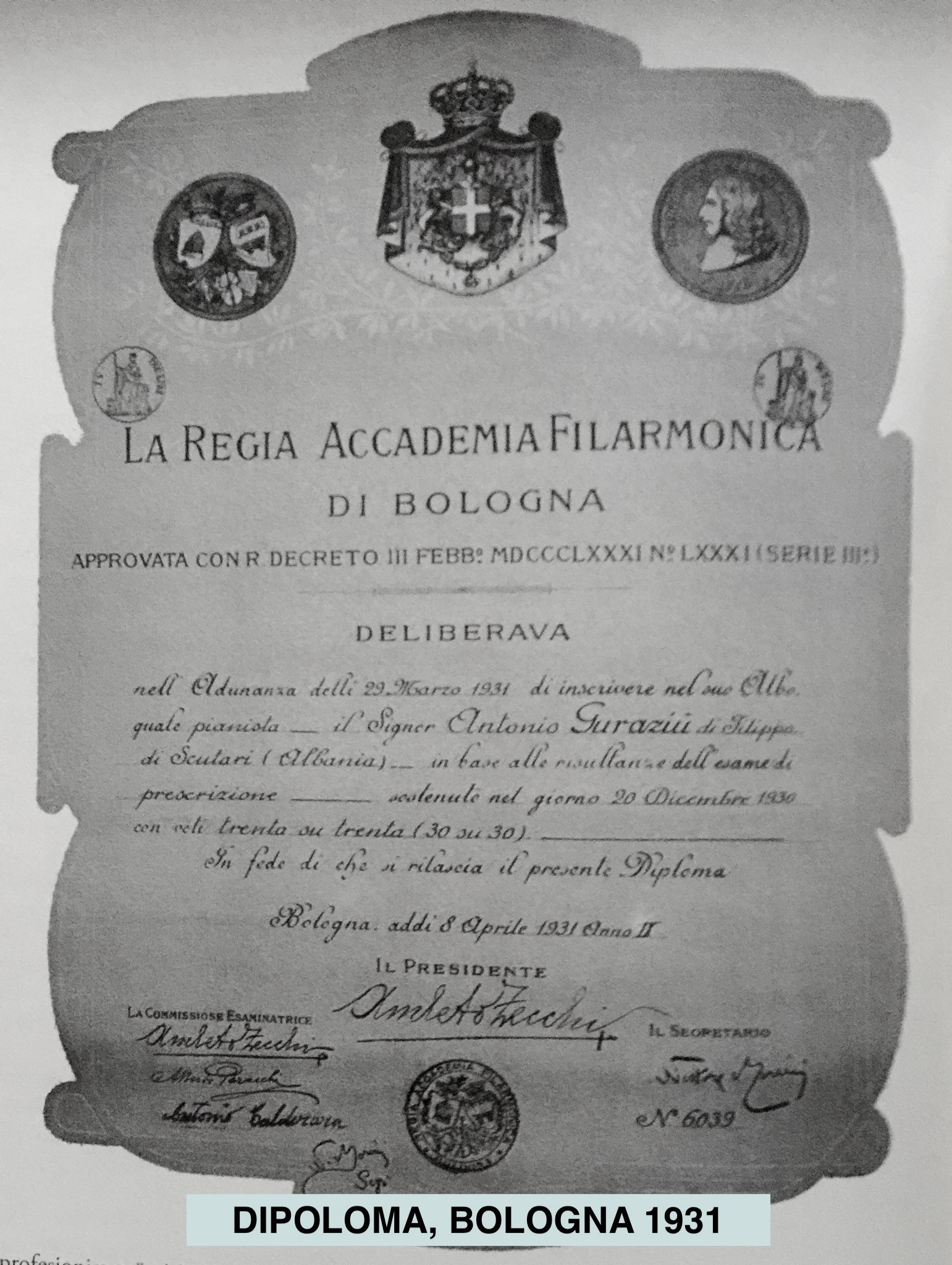 - Tonin Guraziu asht pianisti i parë shqiptar i diplomuem prej nji Akademie Filarmonike Europiane (La Regia Accademia Filarmonica di Bologna, 29.03.1931).