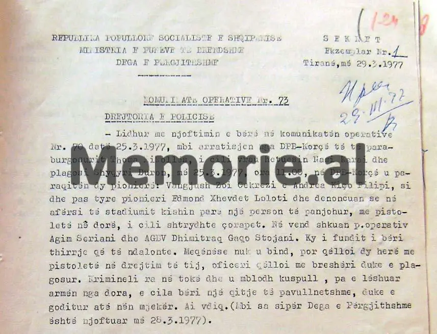 DOKUMENTI ARKIVOR ‘SEKRET’ ME KOMUNIKATËN OPERATIVE TË MINISTRISË SË BRENDSHME, PËR NGJARJEN E NDODHUR NË DEGËN PUNËVE TË BRENDSHME TË RRETHIT TË KORÇËS, MBI RRETHANAT E GJETJES E VRASJES SË SHTETASIT QË VRAU HETUESIN NASI KARAI