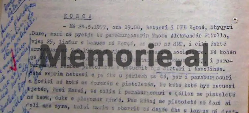 Lidhur me njoftimin e bërë në komunikatën operative Nr. 70. datë 25.3.1977, mbi arratisjen nga Dega e Punëve të Brendshme Korçë, të të paraburgosurit Thoma Nikollës, i cili vrau hetuesin Nasi Karai dhe plagosi Shyqëri Duron, më 25.3.1977, ora 11.00, në DPB në Korçë, u paraqitën dy pionierë, V….. Z…..Ç…. dhe A…. K….F…., si dhe pas tyre pionieri E…. Xh….L…., dhe denoncuan se në afërsi të stadiumit kishin parë një person të panjohur, me pistoletë në dorë, i cili shtrydhte çorapet.