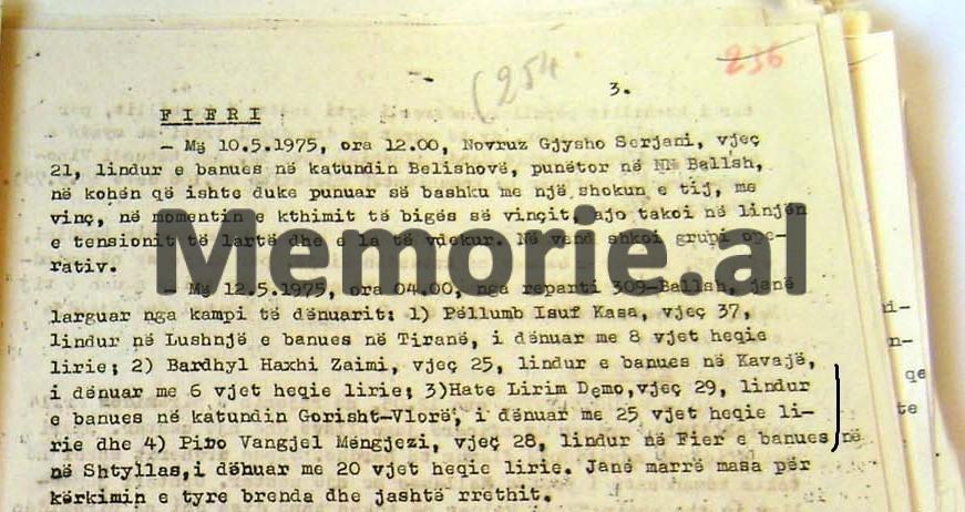 Më 12.5.1975, ora 04.00, në repartin 309 Ballsh., janë larguar nga kampi të dënuarit; 1) Pëllumb Isuf Kasa, vjeç 37, lindur në Lushnje dhe banues në Tiranë, i dënuar me 8 vjet heqje lirie; 2) Bardhyl Haxhi Zaimi, vjeç 25, lindur dhe banues në Kavajë, i dënuar me 6 vjet heqje lirie; 3) Hate Lirim Demo, vjeç 29, lindur dhe banues në fshatin Gorisht Vlorë, i dënuar me 26 vjet heqje lirie; 4) Piro Vangjel Mëngjesi, vjeç 28, lindur në Fier dhe banues në Shtyllas, i dënuar me 20 vjet heqje lirie. Janë marrë masa për kërkimin e tyre, brenda dhe jashtë rrethit.