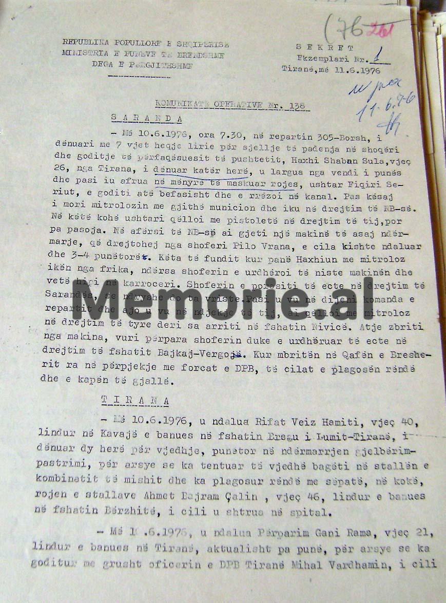 RAPORT – INFORMACIONI SEKRET I MINISTRISË SË BRENDSHME, PËR ARRATISJEN NGA KAMPI I BORSHIT TË SARANDËS, I TË DËNUARIT POLITIK HAXHI SHABAN SULA, MË 11 QERSHOR 1976