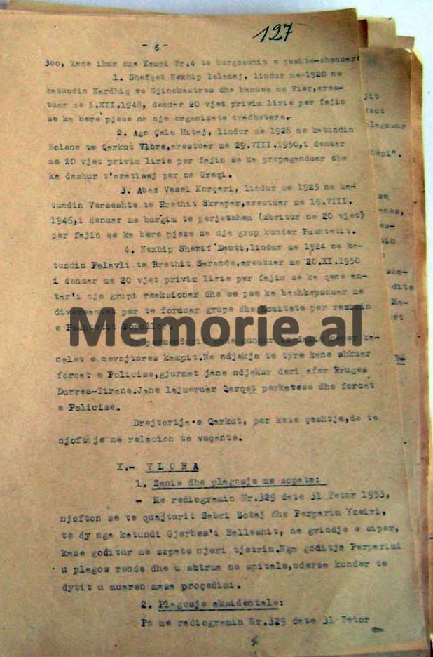 - Shefqet Nexhip Islami, lindur në vitin 1920 në fshatin Kardhiq të Gjirokastrës dhe banues në Fier, arrestuar më 1.XII.1948, dënuar me 20 vjet privim lirie, për fajin se ka bërë pjesë në një organizatë tradhtare.