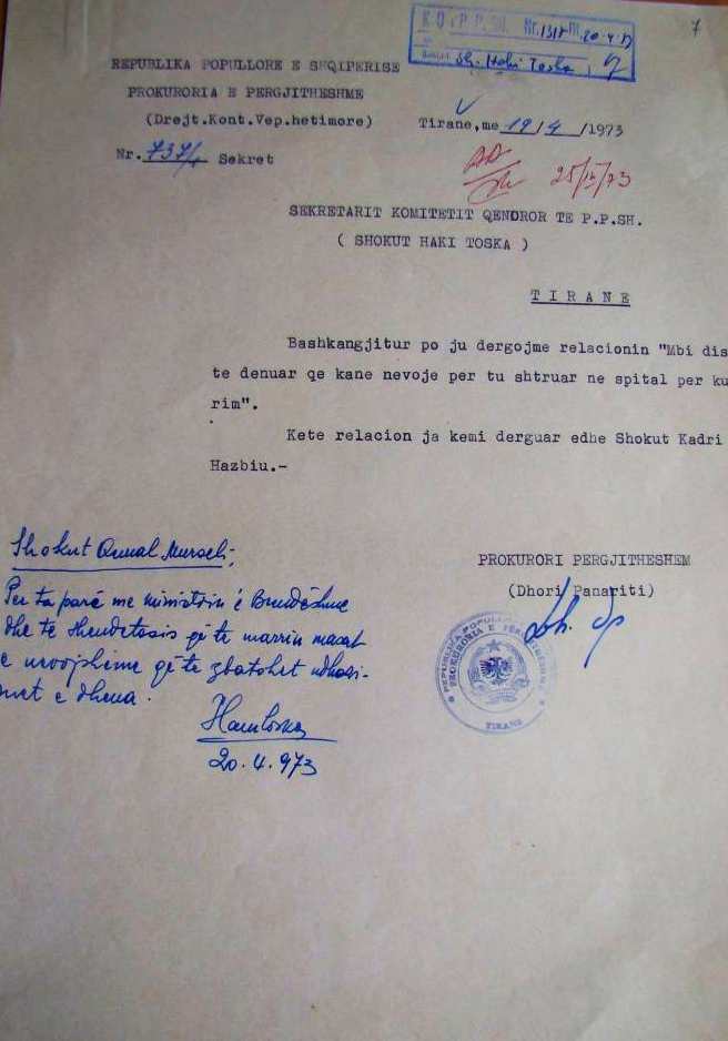 DOKUMENTI ARKIVOR ME RAPORT-INFORMACIONIN E PROKURORIT TË PËRGJITHSHËM DHORI PANAROTI, DËRGUAR SEKRETARIT TË KOMITETIT QENDROR TË PPSH, HAKI TOSKA, PËR PROBLEMET SHËNDETËSORE TË BURGOSURVE NË KAMPET DHE BURGJET