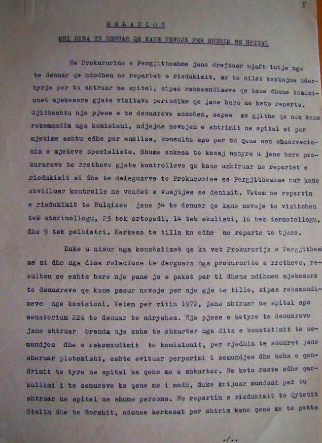Duke u nisur nga konstatimet që ka vetë Prokuroria e Përgjithshme si dhe nga disa relacione të dërguara nga prokuroritë e rretheve, rezulton se është bërë një punë jo e pakët për t’i dhënë ndihmën mjekësore të dënuarve që kanë pasur nevojë për një gjë të tillë, sipas rekomandimeve nga komisioni. Vetëm për vitin 1972, janë shtruar në spital apo sanatorium 226 të dënuar të ndryshëm.