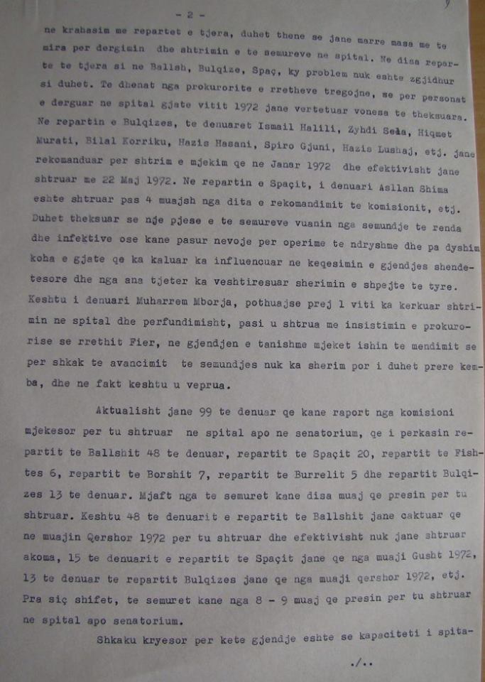 Kështu ndërsa të dënuarit e reparteve të Ballshit, Spaçit apo Bulqizës, qëndrojnë pa u shtruar në spital që nga muaji qershor e gusht 1972, të dënuar të tjerë nga këto reparte apo nga reparti i Burrelit dhe Borshit, ndonëse me sëmundje të njëjta janë rekomanduar dhe shtruar brenda një kohe të shkurtër në muajin dhjetor 1972 ose janar e shkurt 1973.