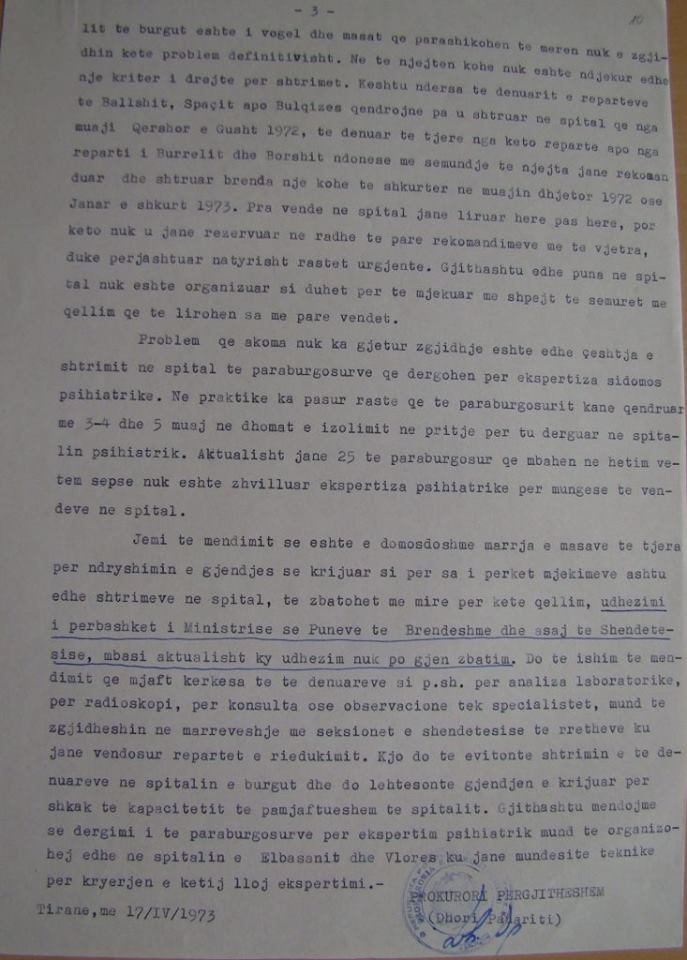 Kjo do të evitonte shtrimin e të dënuarve në spitalin e burgut dhe do lehtësonte gjendjen e krijuar për shkak të kapacitetit të pamjaftueshëm të spitalit. Gjithashtu mendojmë se dërgimi i të paraburgosurve për ekspertin psikiatrik mund të organizohej edhe në spitalin e Elbasanit dhe Vlorës ku janë mundësitë teknike për kryerjen e këtij lloj ekspertimi./ Memorie.al
