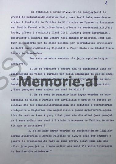 Me vendim të datës 25.4.1983, të përgjegjësit të grupit të Hetuesisë, Sh. Hekuran Isai, neve, Vasil Kola, zëvendës-sekretar i Komitetit të Partisë së Ministrisë së Punëve të Brendshme; Baudin Kazani e Dhimitër Lazri, oficerë të Kundërzbulimit, Vehip Proda, oficer i Zbulimit; Llazi Cici jurist; Tomorr Lapardhaja, instruktor i Kuadrit dhe Qendro Koçi, inxhinier ndërtimi, jemi caktuar si ekspertë për të dhënë mendime për veprimtarinë armiqësore të Kadri Hazbiut, Mihallaq Ziçishtit e Feçor Shehut, në Ministrinë e Punëve të Brendshme.