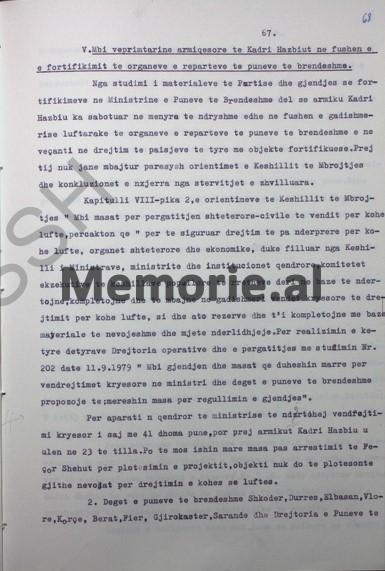 Nga analiza në tërësi e veprimtarisë armiqësore në fushën e fortifikimit në Organet e Punëve të Brendshme, arrijmë në konkluzion se armiqtë Kadri Hazbiu e Feçor Shehu kanë sabotuar vijën e Partisë dhe kërkesat e Artit Ushtarak Popullor në fortifikimin dhe i kanë krijuar pasoja të dëmshme mbrojtjes së vendit në rast lufte./ Memorie.al