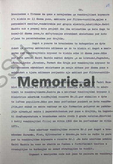 - Mbi veprimtarinë armiqësore të Kadri Hazbiut në fushën e fortifikimit të organeve e reparteve të Punëve të Brendshme: