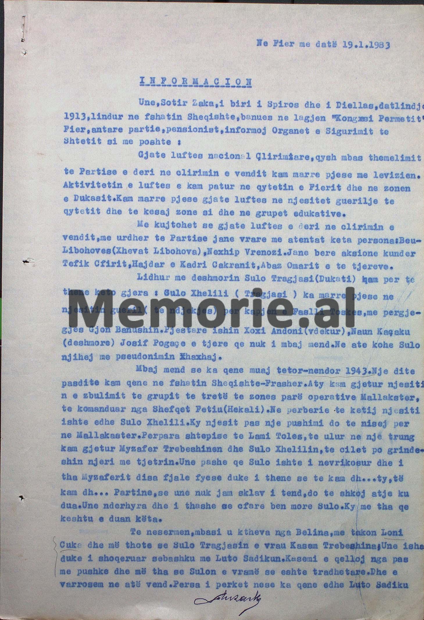Unë, Sotir Zaka, i biri i Spiros dhe i Diellës, datëlindja 1913, lindur në fshatin Sheqishtë, banues në lagjen “Kongresi i Përmetit” në Fier, anëtar partie, pensionist, informoj organet e Sigurimit të Shtetit, si më poshtë: