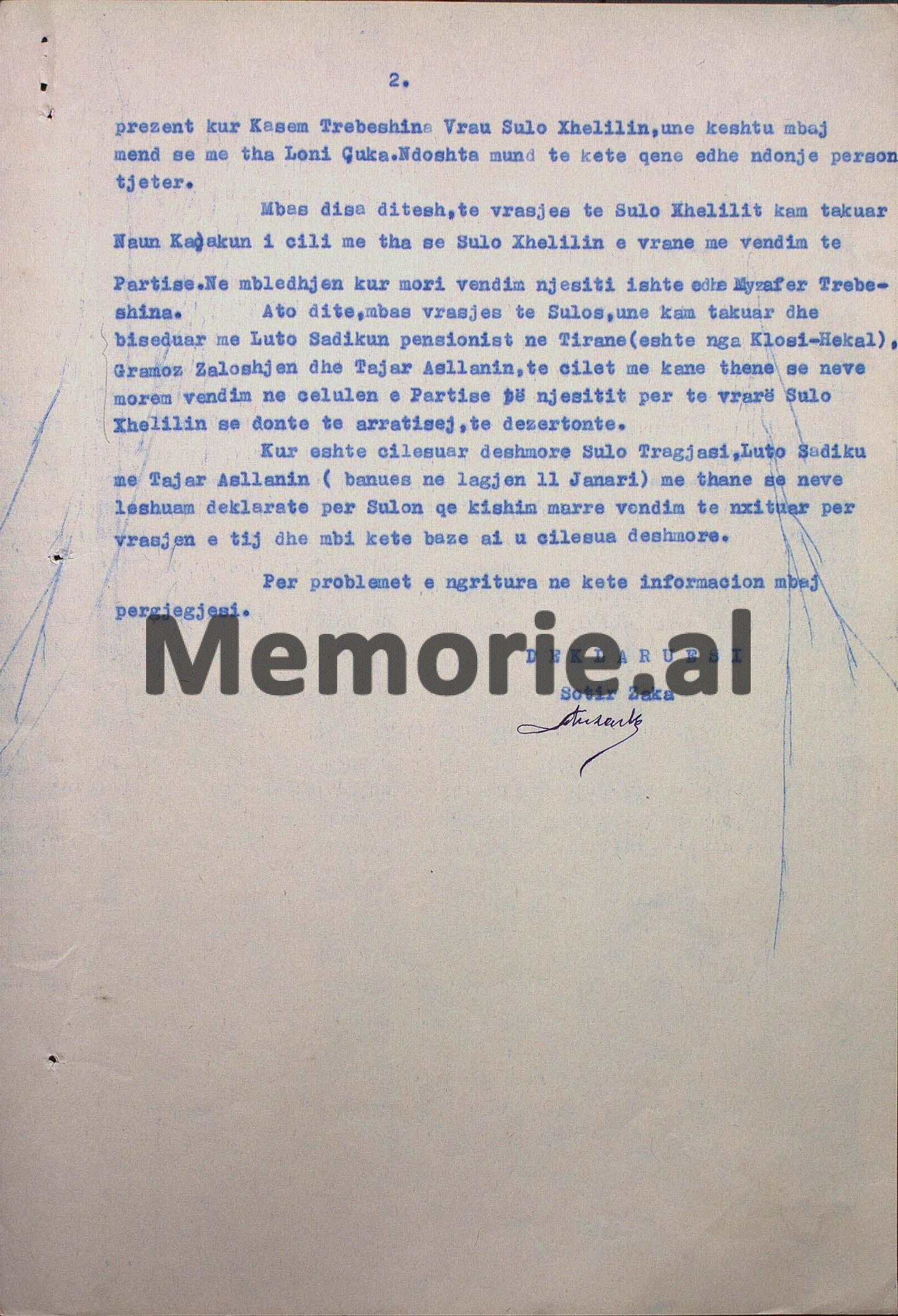 DOKUMENTI ARKIVOR ME DEKLARATËN E SOTIR SPIRO ZAKA NGA QYTETI I FIERIT, DHËNË HETUESIT TË SIGURIMIT TË SHTETIT SOTIR ZAKA, LIDHR ME RRETHANAT E VRASJES SË DËSHMORIT SULO TRAGJASI, NGA ANA E KASEM TREBESHINËS NË NËNTOR 1943