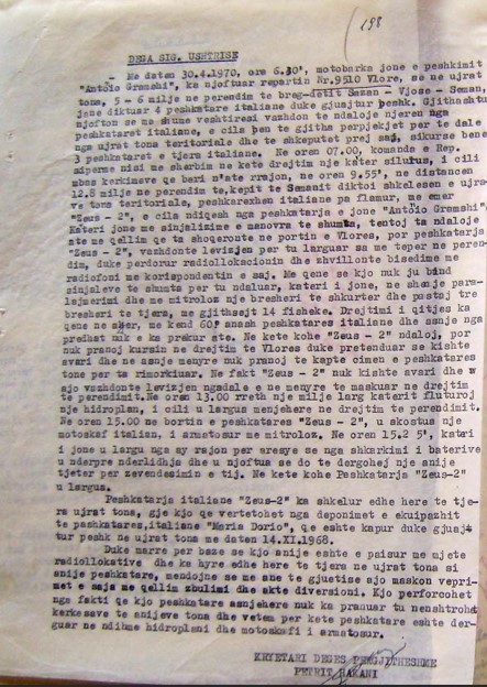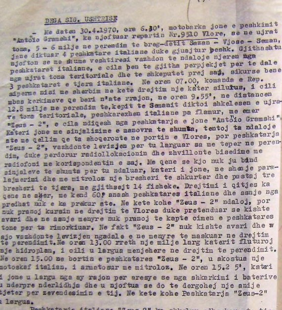 Më datën 30.4.1970, ora 6.30, motobarka jonë e peshkimit, “Antonio Gramshi”, ka njoftuar repartin Nr. 9510 Vlorë, se në ujërat tona, 5 – 6 milje në perëndim të bregdetit Sazan – Vjosë – Seman, janë diktuar 4 peshkatore italiane, duke gjuajtur peshk. Gjithashtu njofton se me shumë vështirësi, vazhdon të ndalojë njërën nga peshkatoret italiane, e cila bën të gjitha përpjekjet për të dalë nga ujërat tonë territoriale dhe të shkëputet prej saj, sikurse bënë tre peshkatoret e tjera italiane.