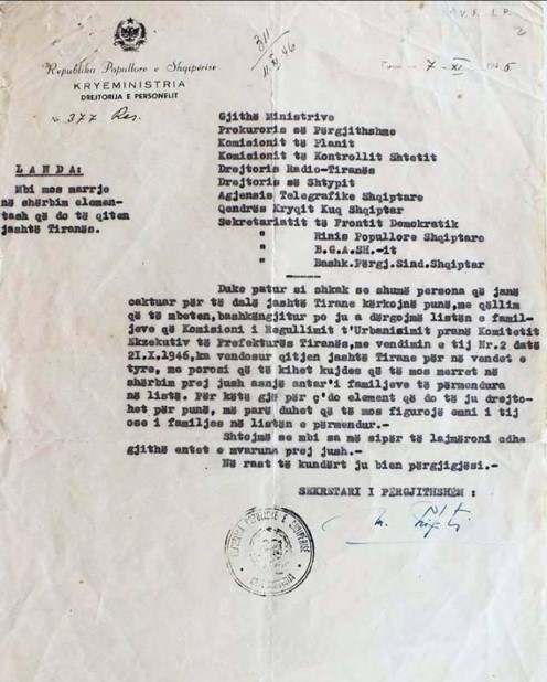 Në letrën e datës 7.11.1946, thuhej: “Duke patur si shkak se shumë persona që janë caktuar për të dalë jashtë Tirane kërkojnë punë, me qëllim që të mbeten, bashkëlidhur po jua dërgojmë listën e familjeve të Komisioni i Rregullimit të Urbanizimit pranë Komitetit Ekzekutiv të Prefekturës së Tiranës, me vendimin nr.2, datë 21.10.1946, ka vendosur qitjen jashtë Tirane për në vendet e tyre, me porosi që të kihet kujdes që të mos merret në shërbim prej jush, asnjë anëtar i familjeve të përmendura në listë.