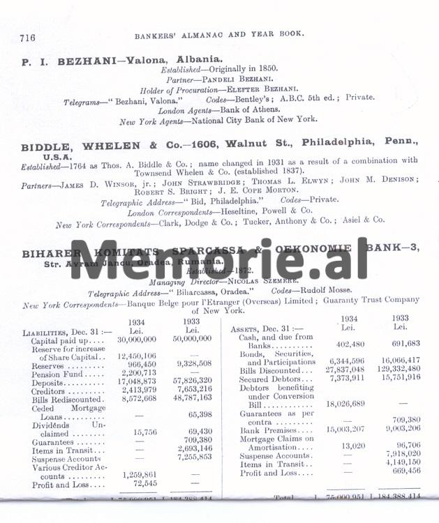 Po në atë Almanak janë dhënë e përmenden edhe Bankat që kanë ekzistuar gjatë viteve të Monarkisë së Zogut në Shqipëri, si “Banka Nacionale e Tiranës”, me degët e saj në Shkodër, Korçë, Durrës, Vlorë, Sarandë e Gjirokastër dhe krahas tyre në fund jepet edhe Banka private e “P.I. Bezhanit”. Që nga krijimi i asaj Banke e deri në vitet e para të shekullit të kaluar kur u shpall Pavarësia e Shqipërisë, Bezhanët u muarën me atë lloj aktiviteti financiar dhe njëkohësisht edhe me tregti me shtetet fqinje, si Italinë, Greqinë e deri me Egjiptin. Lidhur me ekzistencën dhe fuqinë ekonomike të familjes Bezhani, dëshmojnë edhe tre varre që ruhen edhe sot në gjendje të mirë pranë Manastirit të ishullit të Zvërnecit, të cilët i përkasin Josif dhe Olimbi Bezhanit dhe datojnë vitet 1902 e 1918-të.