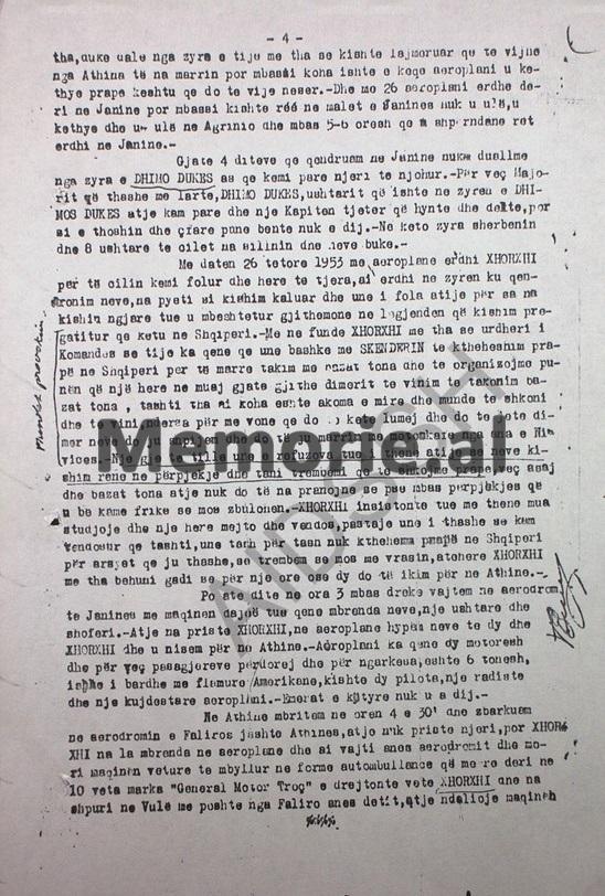 Po atë ditë në ora 3 pas dreke, vajtëm në aerodrome të Janinës me makinën “Daçë”, tue qenë brenda neve, një ushtar dhe shoferi. Atje na priste XHORXHI, në aeroplan hipëm neve të dy dhe XHORXHI dhe u nisëm në Athinë. Aeroplani ka qenë dy motorësh dhe përveç pasagjerëve, përdorej edhe për ngarkesa, është 6 tonësh, ishte i bardhë dhe me flamurë amerikanë, kishte dy pilotë, një radist dhe një kujdestar aeroplani.