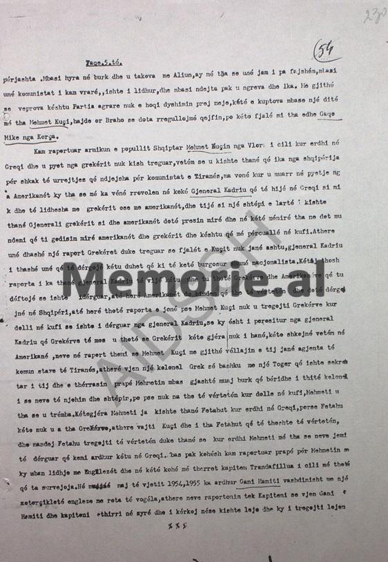Atëhere thotë raporti jonë, – pse Mehmet Kuçi nuk u tregoj grekëve kur dolli në kufi, se ishte dërguar nga gjeneral Kadriu, se ky është i porositur nga gjeneral Kadriu, që grekëve të mos u thotë, se grekërit këto gjëra nuk i hanë, këto shkojnë vetëm në amerikanët, neve në raport themi se Mehmet Kuçi me vëllanë e tij, janë agjentë të komunistëve të Tiranës, atëhere vjen një kolonel grek së bashku me një toger grek që ishte sekretar i tij dhe e thërrasin përsëri Mehmetin, mbas gjashtë muaj burg që bëri dhe i thotë koloneli se neve të njohim dhe shtëpinë, po pse nuk na the të vërtetën kur dole në kufi?!