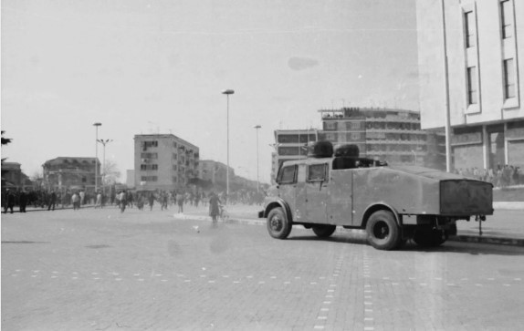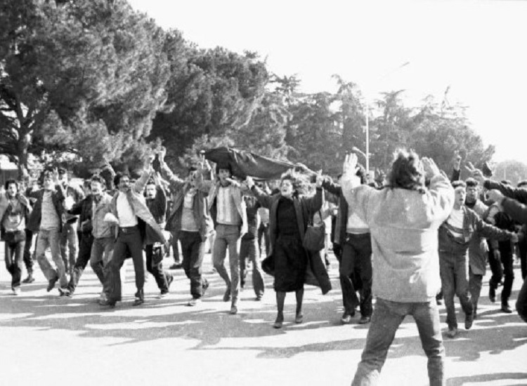 -“Doni të ngjallni diktatorin, por nuk kemi për t’iu lënë. Kthehuni se do ta pësoni keq”. Pa komandë, pa udhëheqës, djemtë e “Skelës”, filluan të ndjekin turmën, që marshonte (shumë ishin larguar) në mes të bulevardit, ku spikasnin instruktorët dhe sekretarët e partisë, që lëviznin gjithandej dhe ruanin kompaktësinë e turmës. Me gjithë të sharat dhe ofendimet, “vullnetarët” me portretet e Enver Hoxhës, vazhdonin përpara. Atëherë grupi i vogël, që lëvizte paralel me turmën, e humbi durimin. Dikush lëshoi kushtrimin: “U bini me gurë komunistëve! I qëlloni me gurë zagarët e Enver Hoxhës! Mos i lini qentë e Enver Hoxhës, të shkojnë në ‘Sheshin e Flamurit’! Poshtë komunizmi”!