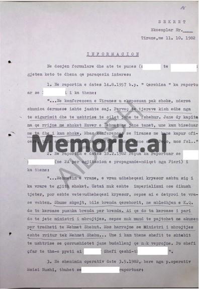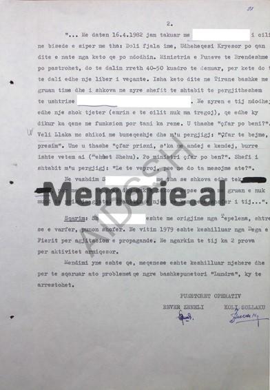 - Në shënimin operativ të datës 3.5.1982, bërë nga Punëtori Operativ, Moisi Nushi, thuhet se (……) ka raportuar: