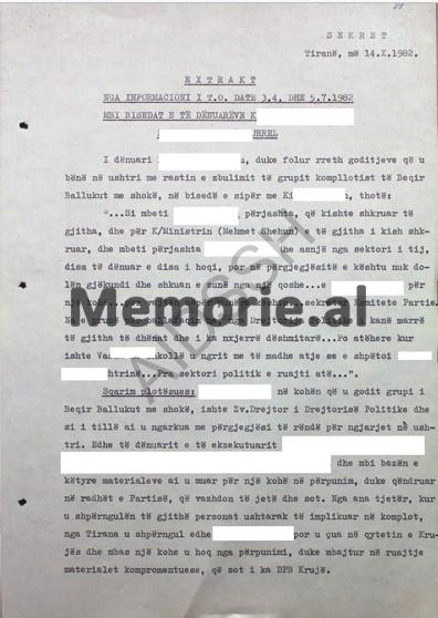 “….Më datën 16.4.1982, jam takuar me (…..) i cili në bisedë e sipër më tha: Doli fjala ime. Udhëheqësi kryesor po qan natë e ditë për këto që po ndodhin. Ministria e Punëve të Brendshme po pastrohet, do të dalin rreth 40-50 kuadro të dënuar, për këtë do të dali dhe një libër i veçantë.