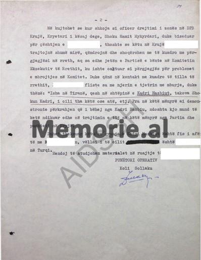 Duhet theksuar këtu se gruaja e Kadri Hazbiut, është fis i afërt me (…….), vëllai i të cilit (………), është (……..), në Turqi. Mendoj të studiohen materialet në ruajtje të (……..). Memorie.al