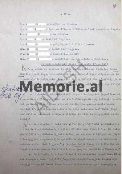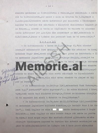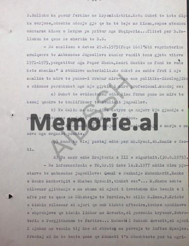 – Në analizën e datës 29.8.1975, (faqe 168), “Mbi veprimtarinë armiqësore të Ambasadës Jugosllave kundër vendit tonë gjatë viteve 1971-1975”, përgatitur nga Feçor Shehu dhe Kadri Hazbiu, në fund kanë vënë këtë shënim: “E studiova materialin. Më duket se është fryt i një analize të mirë të punës – i rrahur mirë nga ana politike dhe ideologjike, e sidomos përshkohet nga një gjykim i mirë profesional. Mendoj se: