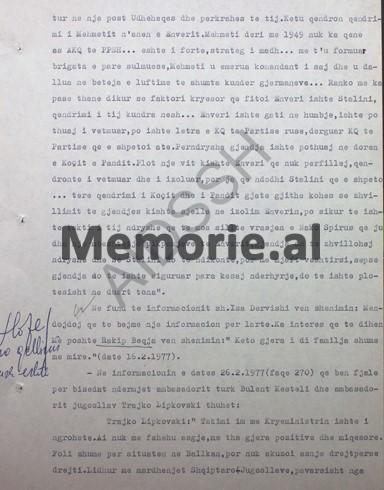 – Në informacionin e datës 26.2.1977, (faqe 270) që bën fjalë për bisedat e ambasadorit turk, Bulent Kestili dhe ambasadorit Jugosllav Trajko Lipkovski, thuhet: