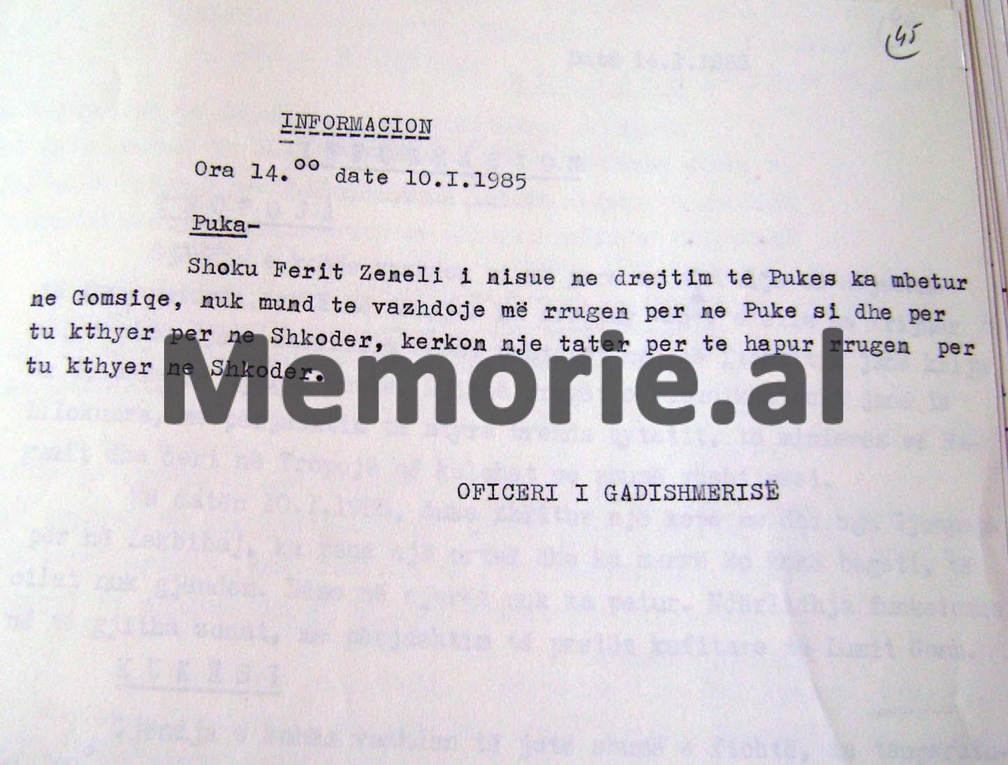 Më datën 9.1.1985, nga posta e Trebishtit është nisur komisari i postës, një nënoficer dhe një ushtar, por nuk dihet a kanë mbërritur, apo jo, dhe për të verifikuar, sot në orën 9.30, në këtë drejtim janë nisur një nënoficer, tre ushtarë dhe fshatarë.