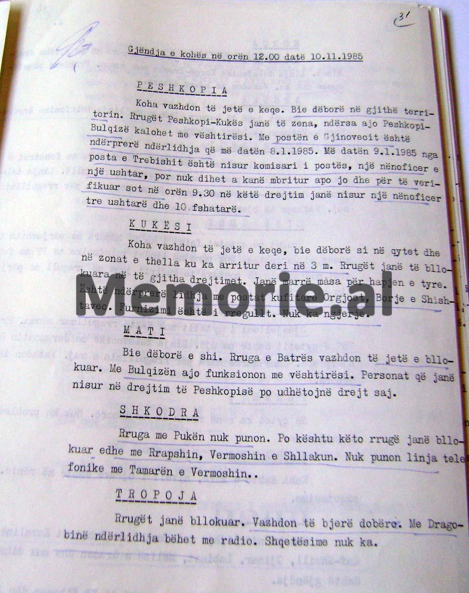 Koha vazhdon të jetë e keqe. Bie dëborë në të gjithë territorin. Rrugët Peshkopi –Kukës, janë të zëna, ndërsa në Peshkopi – Bulqizë, kalohet me vështirësi. Në postën e Gjinovecit është ndërprerë ndërlidhja që me datën 8.1.1985.