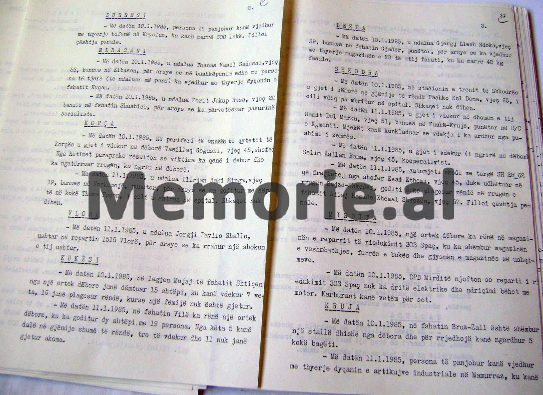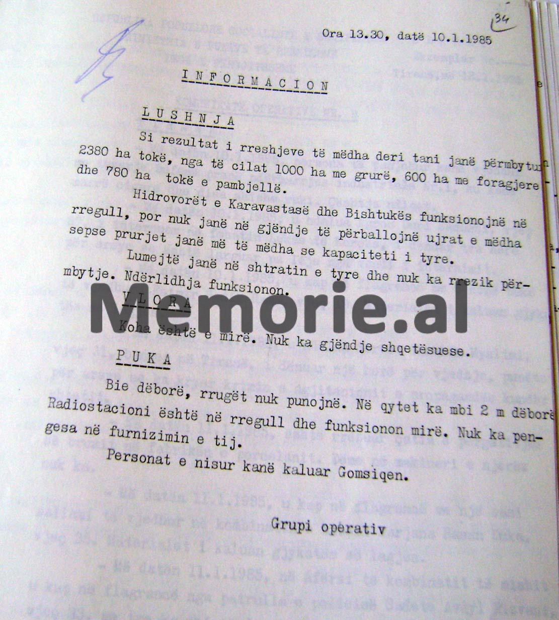 RAPORT- INFORMACIONET SEKRETE TË MINISTRISË SË BRENDSHME, MBI MOTIN E KEQ ME RESHJE TË DENDURA SHIU DHE DËBORE QË PËRFSHIU TË GJITHË SHQIPËRINË MË 7-15 JANAR 1985 DHE DËMET E SHKAKTUARA NË RRETHE TË NDRYSHME NGA PËRMBYTJET, BLLOKIMET E RRUGËVE NACIONALE, ORTEQET E DËBORËS ETJ.