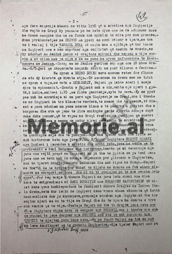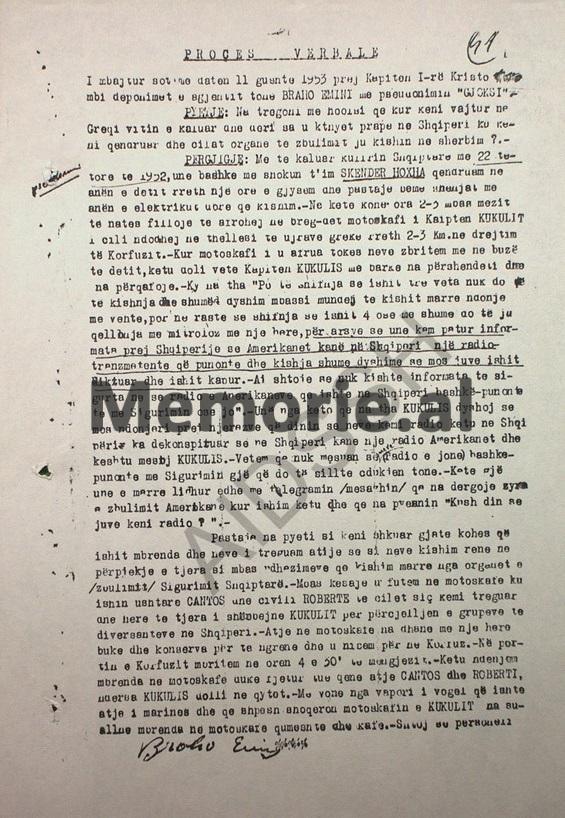 I mbajtur sot më datën 11 gusht 1953, prej kapitenit të Parë, Kristo….mbi deponimet e agjentit tonë “BRAHO EMINI”, me pseudonimin “GJOKSI”.