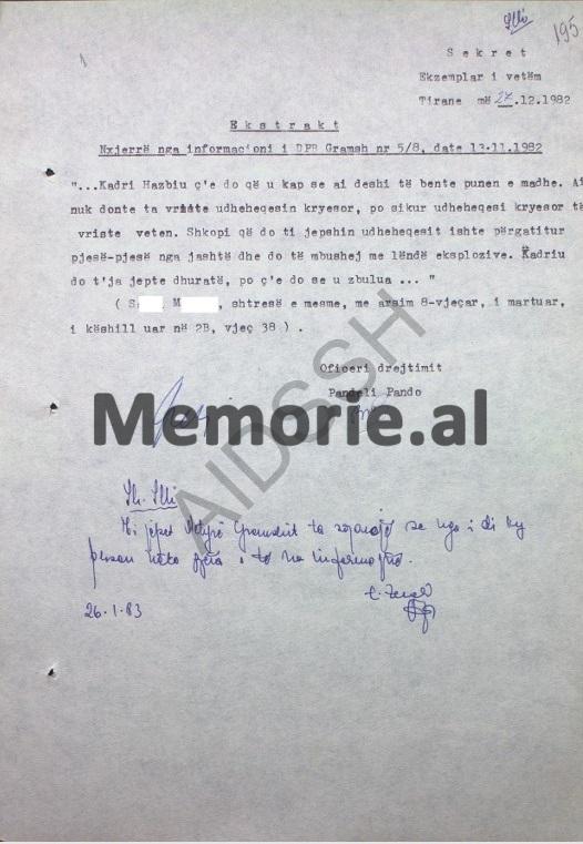 Nxjerrë nga informacioni i Degës së Punëve të Brendshme Gramsh, Nr. 5/8, dt. 13.11.1982.