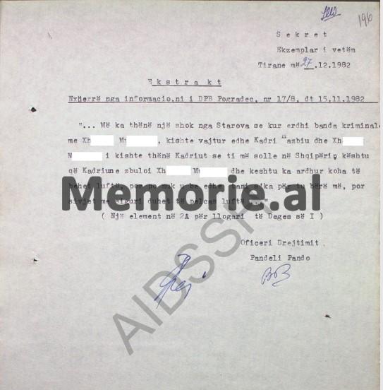 Nxjerrë nga informacioni i Degës së Punëve të Brendshme Pogradec, Nr. 17/8, dt. 15.11.1982.