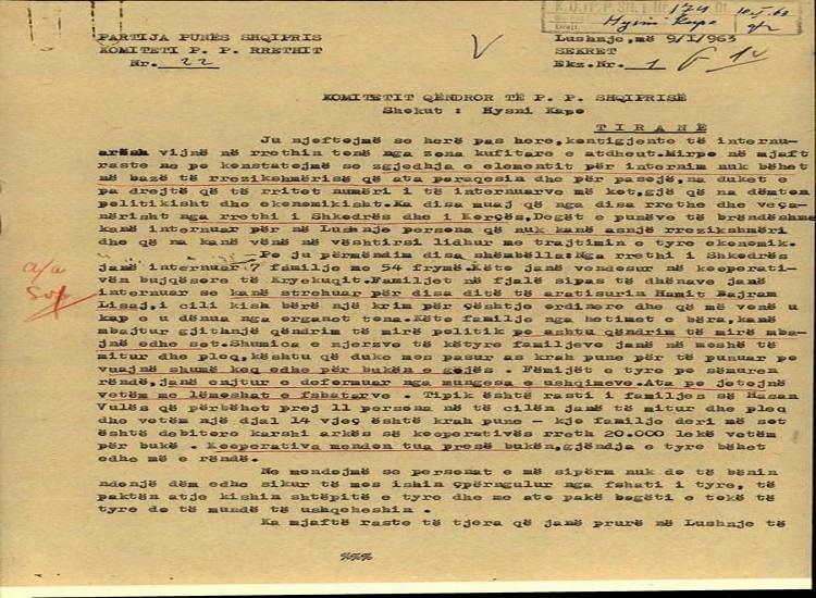 Memorie.al / VNA sjell këtë herë dokumentin sekret të vitit 1963, në të cilin një raport nga rrethi i Lushnjës i drejtohet Hysni Kapos, duke sinjalizuar problemet e shkaktuara nga internimi në masë i familjeve në këtë zonë. Internimi, i menduar si instrument kontrolli dhe shfrytëzimi i fuqisë punëtore, po mbushte kooperativat bujqësore me njerëz që nuk mund të punonin. Dokumenti e trajton popullsinë e internuar si kontingjent pune. Në dokument vihej në diskutim internimi si masë politike, por evidentoheshin problemet që lindnin nga zbatimi i tij në praktikë në Lushnjë, kryesisht në kooperativat bujqësore. Ky raport përbën një dëshmi historike, se si shteti komunist i trajtonte njerëzit si objekte për t’u shfrytëzuar për punë. Në raport, të internuarit trajtoheshin si kontingjente pune.