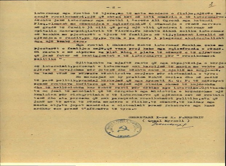 Gjithashtu, të na jepet mundësia që të dërgohet nga Ministria e Brendshme një komision për rishqyrtimin e të internuarve që gjenden sot në rrethin tonë dhe ata persona që nuk paraqesin rrezikshmëri politike, që janë me të meta të rënda mendore e fizike, të sëmurë, të kaluar nga mosha aktive, t’u jepet mundësia e sistemimit pranë fshatrave nga kanë ardhur, ose pranë të afërmve të tyre./ Memorie.al