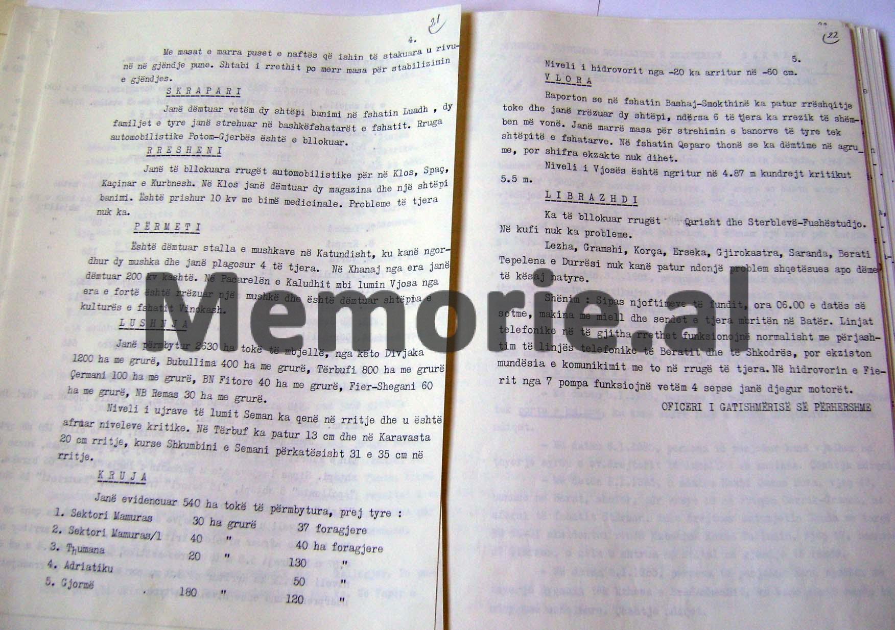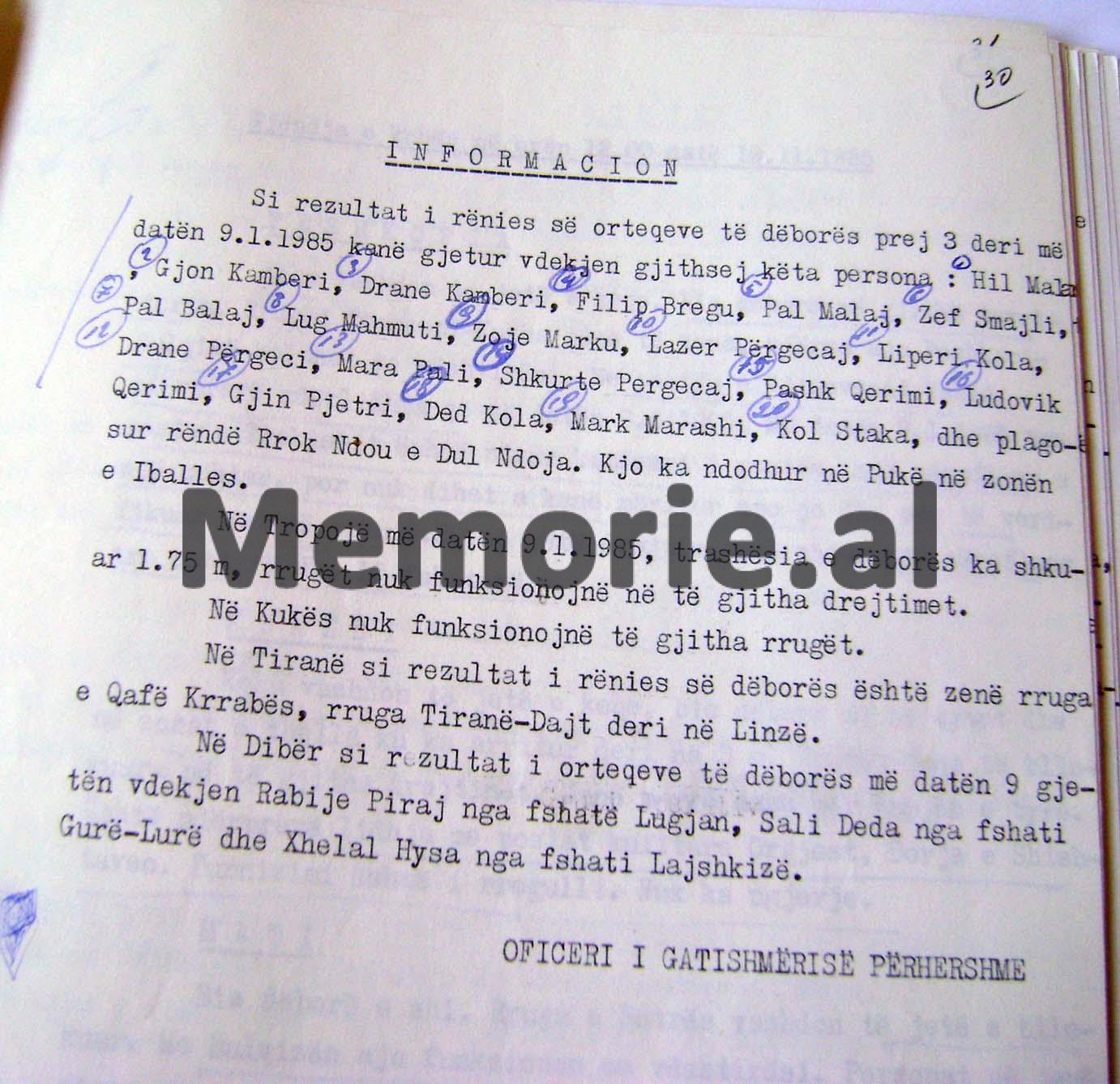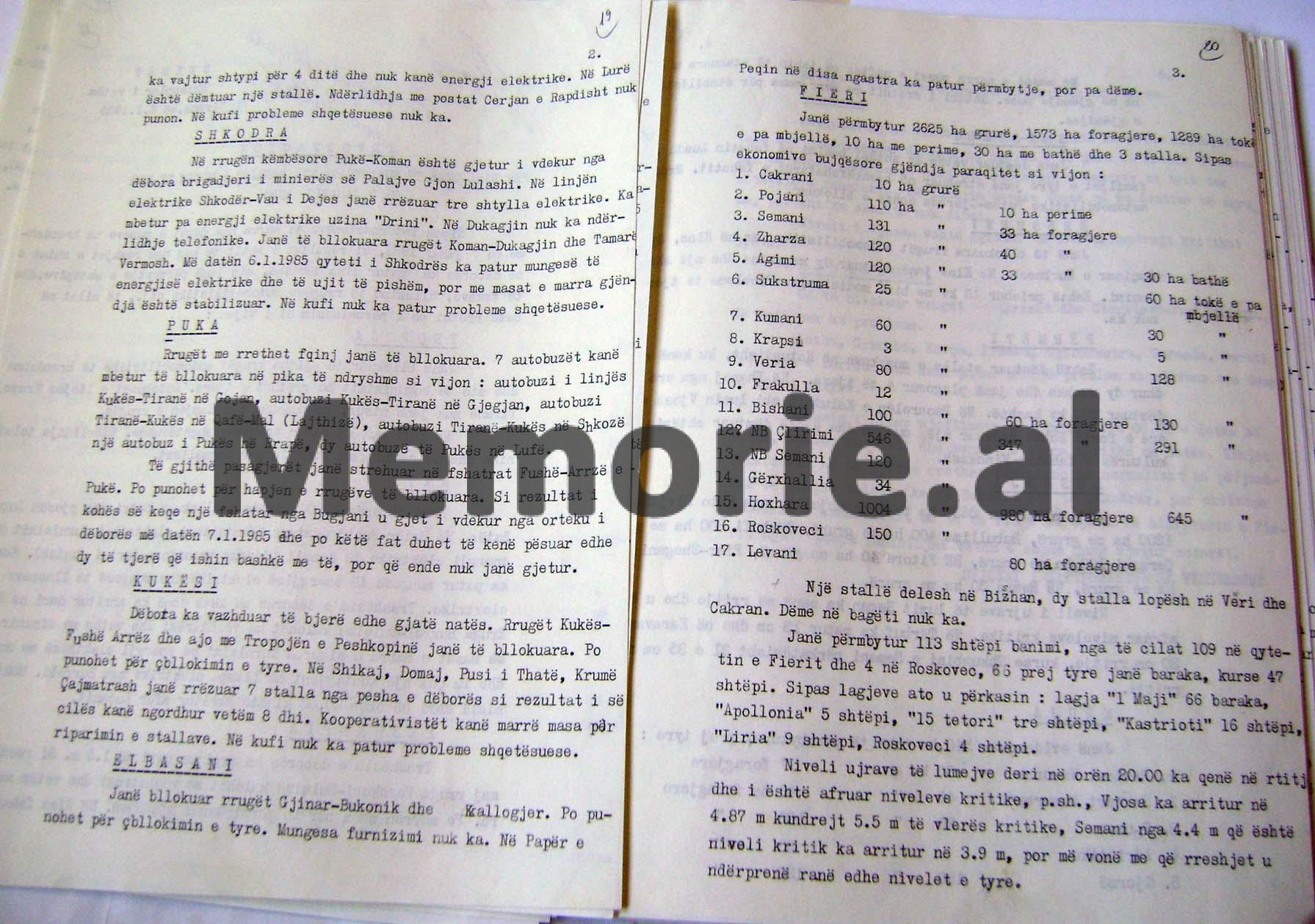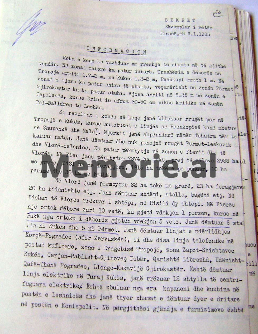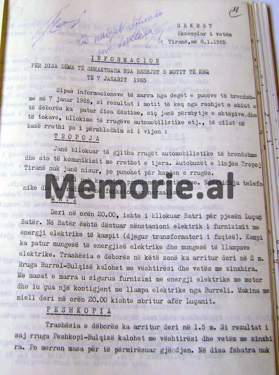 RAPORT- INFORMACIONI SEKRET I MINISTRISË SË BRENDSHME, MBI MOTIN E KEQ ME RESHJE TË DENDURA SHIU DHE DËBORE QË PËRFSHIU TË GJITHË SHQIPËRINË MË 7 JANAR 1985 DHE DËMET E SHKAKTUARA NË RRETHE TË NDRYSHME NGA PËRMBYTJET, BLLOKIMET E RRUGËVE NACIONALE, ORTEQET E DËBORËS ETJ.