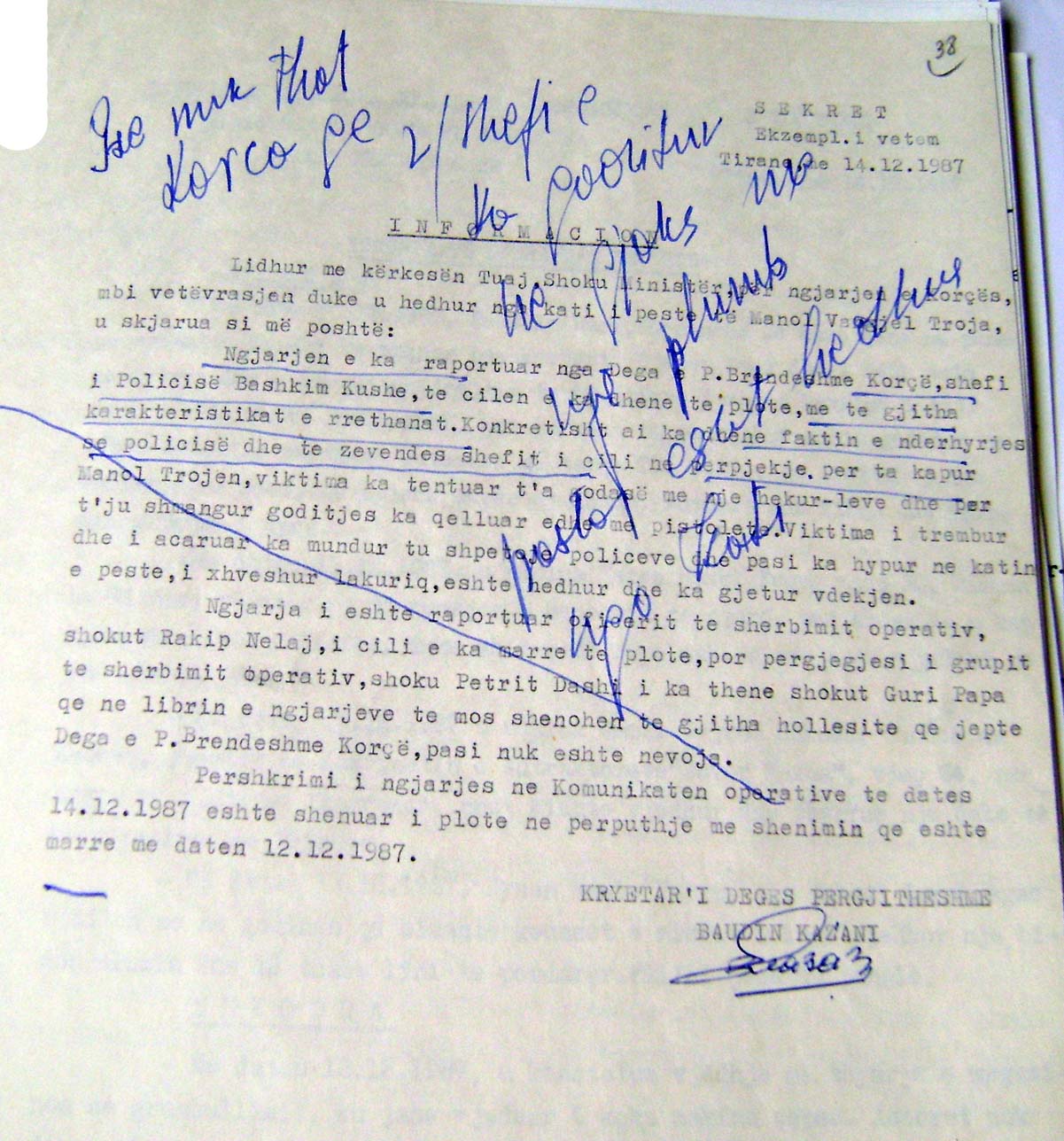 Lidhur me këtë dhe të tjera rreth asaj ngjarje tejet të rëndë që tronditi mbarë qytetin e Korçës në atë mes dhjetori të acartë të vitit 1987, (për të cilën edhe sot pas afro katër dekadash çuditërisht nuk është shkruar as një rresht), na njohin dokumentet arkivore sekrete në fjalë (me faksimilet përkatëse) të nxjerra nga Arkivi i Ministrisë së Brendshme, (tashmë të deklasifikuara), të cilat hedhin dritë për gjithçka ndodhi atë ditë aty, si dhe për të gjitha makinacionet që përdori Dega e Brendshme e Korçës, jo vetëm për ta mbajtur të fshehtë atë ngjarje, por edhe për ta paraqitur si vetëvrasje!