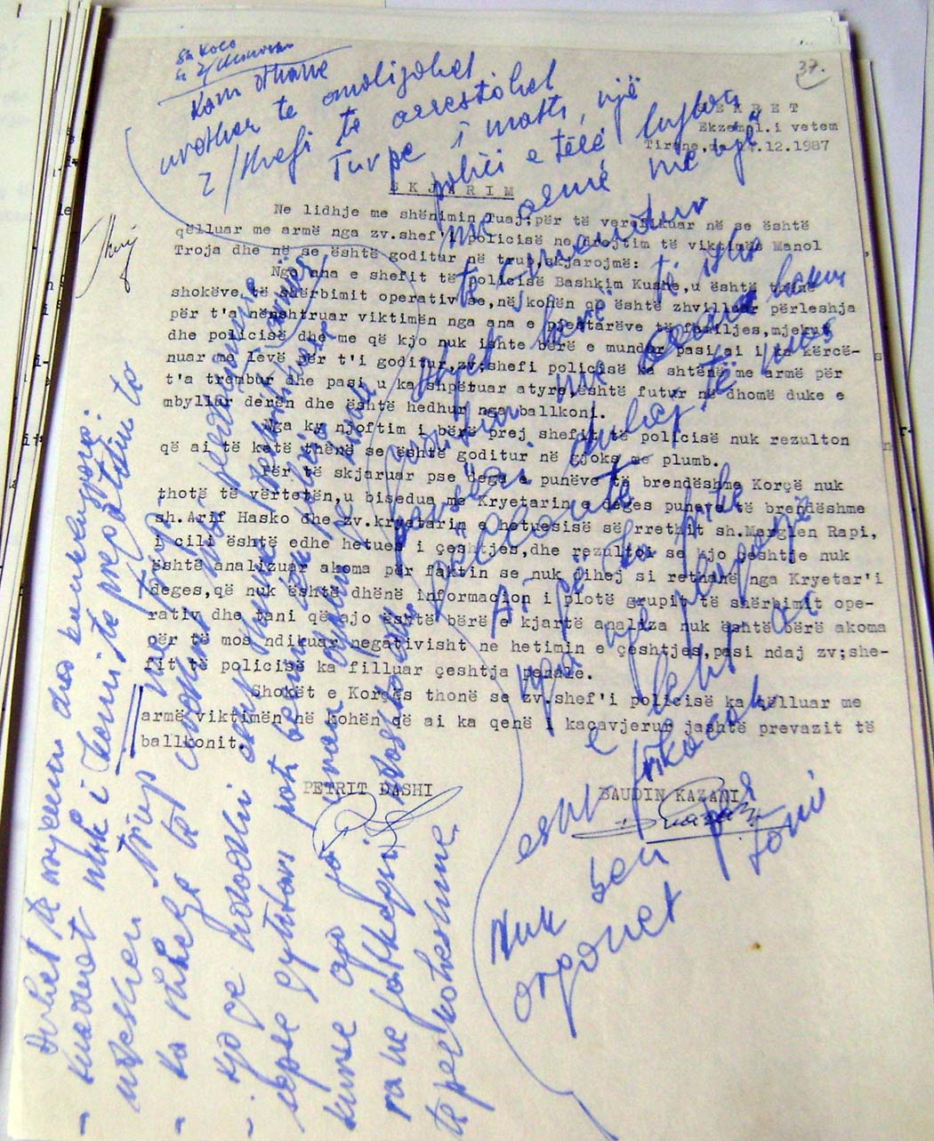 SHËNIMI I MINISTRIT HEKURAN ISAI, MBI DOKUMENTIN KU PËRSHKRUHET NGJARJA E RËNDË E NDODHUR NË QYTETIN E KORÇËS, ME DT.12.12.1987, KU POLICIA VRAU NJË QYTETAR