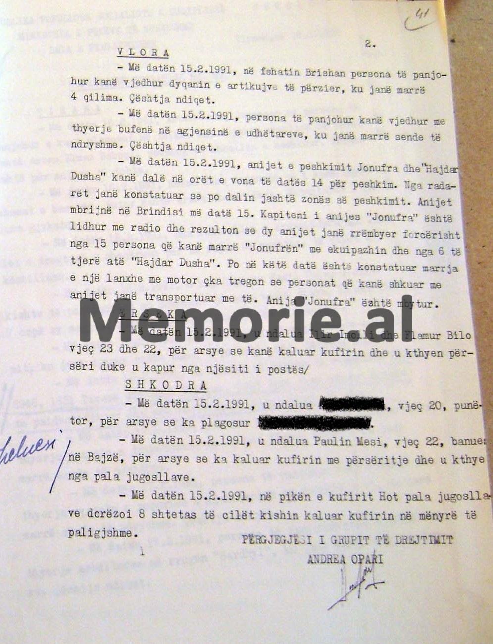 – Më datën 28.2.1991, në afërsi të porteve në Vlorë ka grumbullime njerëzish që presin për të kaluar kufirin në mënyrë të paligjshme. Shumë të rinj u futën në një anije të prishur e shkëputur nga porti dhe lundruan në det në mëshirën e dallgëve dhe të erës.