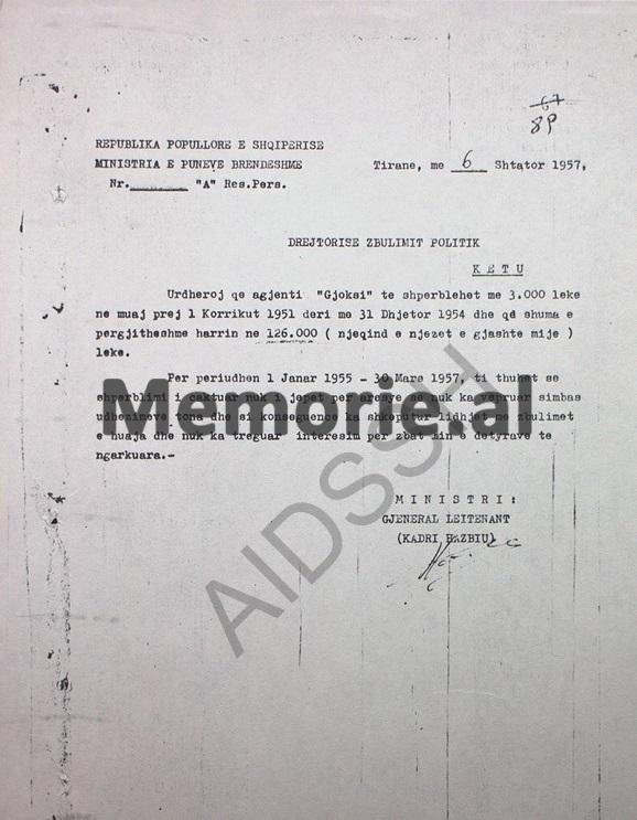 DOKUMENTI ME URDHRIN E MINISTRIT TË PUNËVE TË BRENDSHME GJENERAL-LEITNANT KADRI HAZBIU, DËRGUAR DREJTORISË SË ZBULIMIT POLITIK, PËR SHPËRBLIMIN E AGJENTIT “GJOKSI” ME 126.000 LEKË, PËR PERIUDHËN 1 KORRIK 1951, 31 DHJETOR 1954