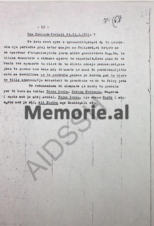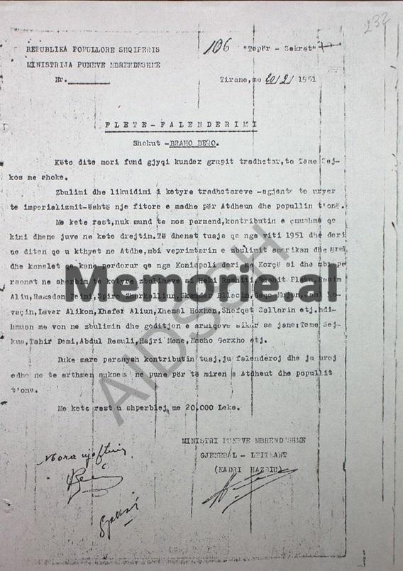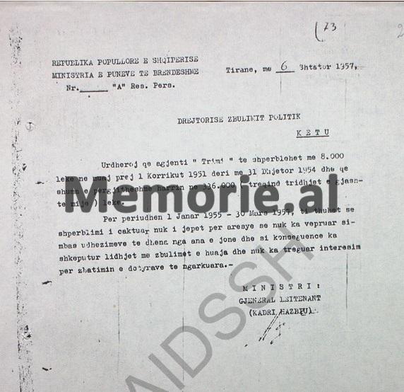Urdhëroj që agjenti “Trimi”, të shpërblehet me 8.000 lekë në muaj, duke filluar prej 1 korrikut 1951, deri më 31 dhjetor 1954 dhe që shuma e përgjithshme harrin në 336.000 (treqind e tridhjet e gjashtë mijë) lekë.